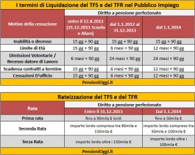 La rateizzazione del Tfs. Ma non è finita. Per le liquidazioni dei trattamenti di importo lordo superiori a 90.000 €, inoltre, ai tempi di liquidazione indicati nella prima tabella bisogna considerare altri 12 mesi dalla 1/a liquidazione per percepire l’importo compreso tra i 90.000 e i 150.000 euro ed attendere ulteriori 12 mesi per la liquidazione della parte della somma eccedente i 150.000 euro. Per coloro che perfezionano il diritto a pensione a partire dal 01.01.2014, i predetti limiti di rateizzazione sono portati da 90.000 a 50.000 e da 150.000 a 100.000.
