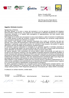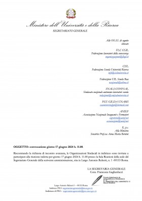 Riscontrando la richiesta di incontro avanzata da FGU GILDA-Unams - Flc Cgil - Cisl Fsur - Uil Scuola Rua - Snals Confsal, il Ministro Bernini convoca le Organizzazioni Sindacali richiedenti a partecipare alla riunione indetta per giorno 17 giugno 2024 h. 11.00 presso la Sala Riunioni della sede del Segretariato Generale della scrivente amministrazione, sita in Largo Antonio Ruberti, n. 1 -00153 Roma