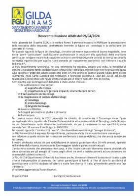 Si Informa che le Confederazioni e le Federazioni Sindacali, sono state convocate presso l'ARAN in data 9 aprile 2024 alle ore 11:00 per un incontro riguardante la prosecuzione della trattativa per la sequenza contrattuale dell’art. 178 del CCNL del personale Istruzione e Ricerca – triennio 2019/2021 – sottoscritto il 18 gennaio 2024. La riunione avrà come oggetto di discussione: lett e) e g) dell’art. 178 del CCNL sopra citato. L’incontro si svolgerà in presenza, presso la sede dell’A.Ra.N.(Agenzia per la Rappresentanza Negoziale delle Pubbliche Amministrazioni).