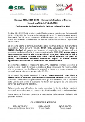 Si comunica che il giorno 3 novembree 2022 alle ore 10,30, sono state convocate le OO.SS. rappresentative presso l’Aran per la prosecuzione della trattativa per il rinnovo del CCNL del personale del comparto Istruzione e Ricerca relativo al triennio 2019 – 2021. La riunione avrà come oggetto di discussione l’ordinamento professionale Università. L’incontro si terrà in modalità mista con la presenza presso la sede dell’ARAN dei Capi delle delegazioni sindacali ed in collegamento on line tramite piattaforma per video per gli altri componenti. Sarà nostra cura dare opportuna informazione sugli sviluppi dell’incontro.
