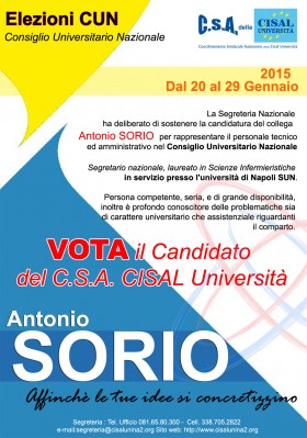 La Segreteria Nazionale ha deliberato di sostenere la candidatura del collega Antonio SORIO per rappresentare il personale tecnico-amministrativo nel Consiglio Universitario Nazionale (CUN).
